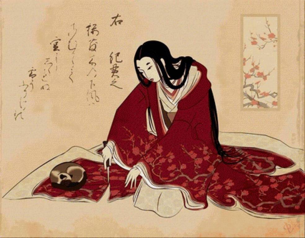 " Женщина отрезает кусок кимоно чтобы не разбудить кошку."