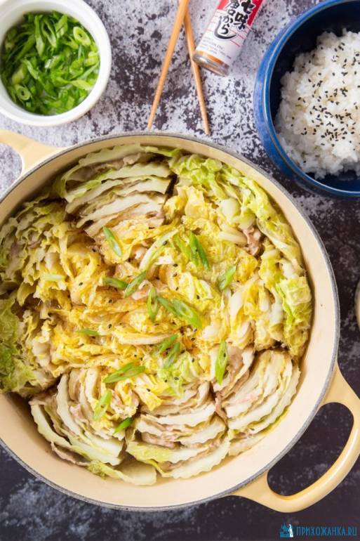 Берется салат. Любой только не с тонкими листьями. Между листьями кладется бекон или тонко нарезаное мясо. Укладывается в кастрюлю. Залеваетя куриным или овощным бульоном на 2/3. В бульон добавить сойевого соуса, спецей, зелёный лук и имбирь. Можно ещё шампиньонов закинуть. Довести до кипения и варить 8-10 мин.