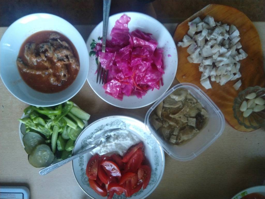 У нас опять оливье, дочь сделала. Я натушила свинины, варила гречку, сделала салат из огурцов и помидоров с маслом, нажарила кабачковых оладьев.