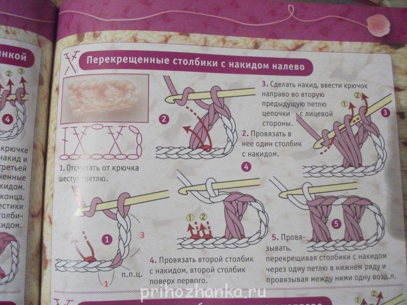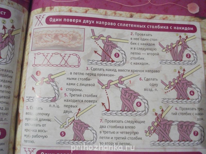 1-й ряд: 3 в.п., 1 ст.сн, ст.сн в третью в.п. цепочки, в.п., ст.сн в ту же петлю, через 2 .п. цепочки 4 ст.сн и т.д.