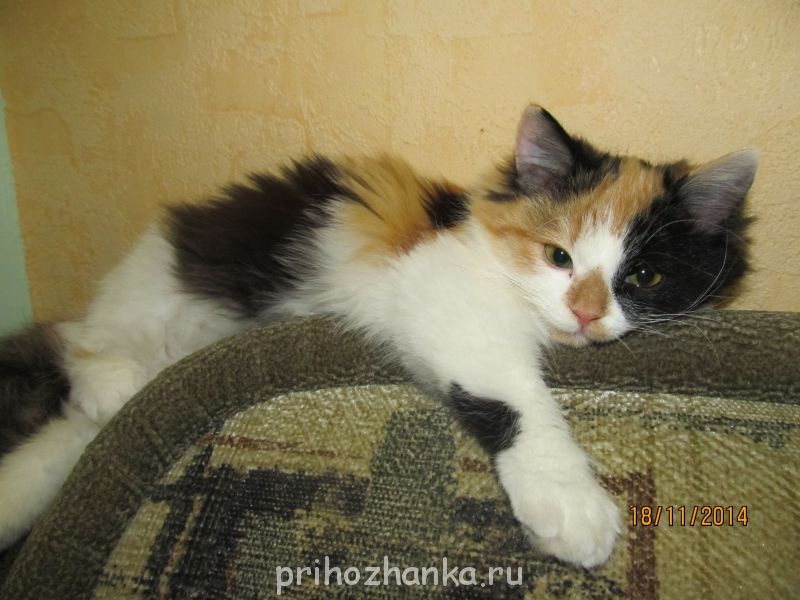 Счастливая трехцветная кошка. А глаза желтые или зеленые?