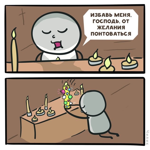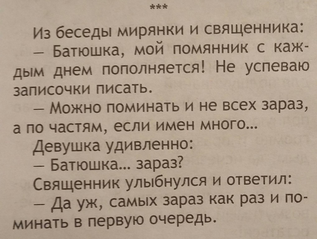 - Вишь, Нюра, а вчера этот же поп в телевизоре распинался, что молоко в пост нельзя пить.