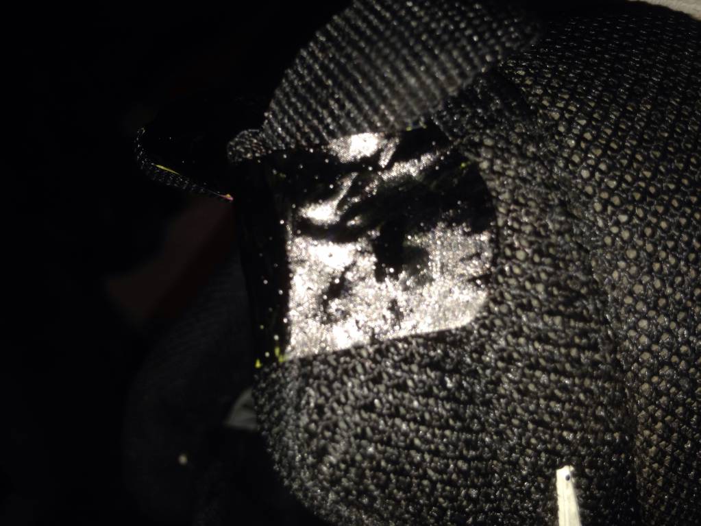 с внутренней стороны образовалась дыра, сзади. Клея нет, ребенок думал думал и заклеил пластырем. Черным маркером закрасил