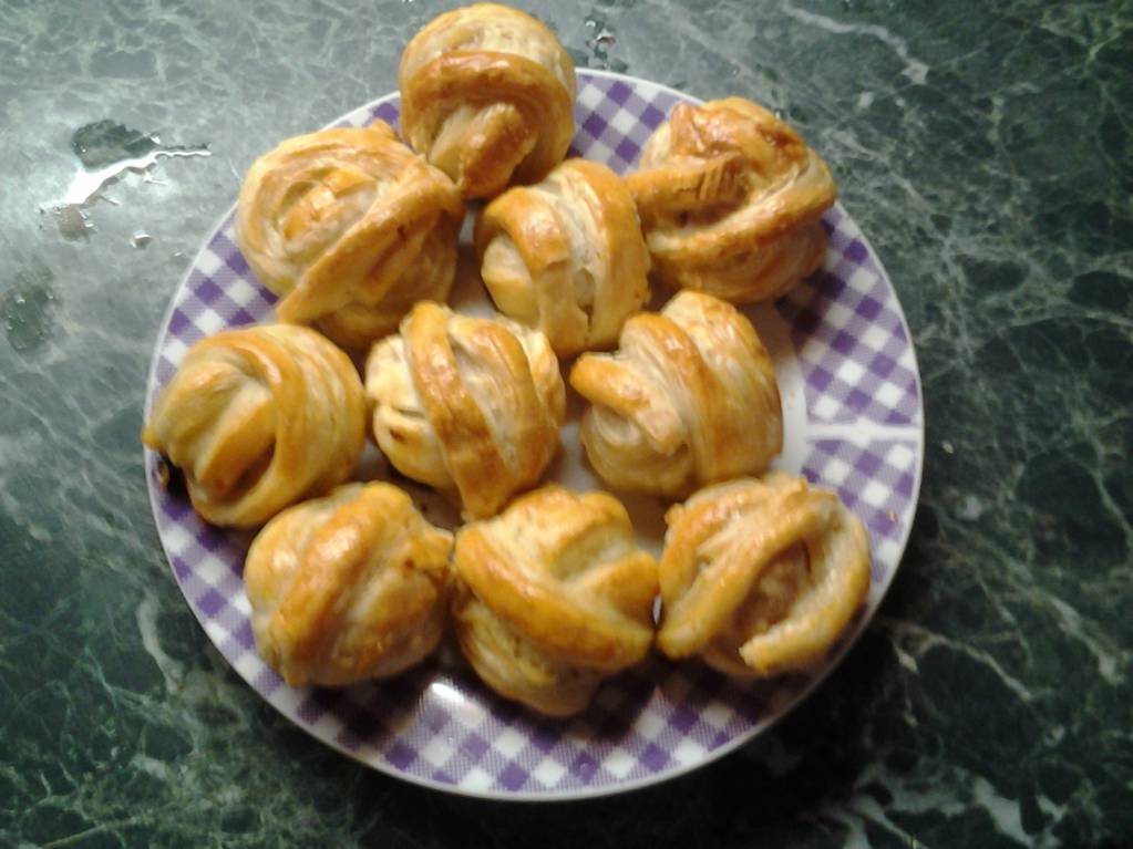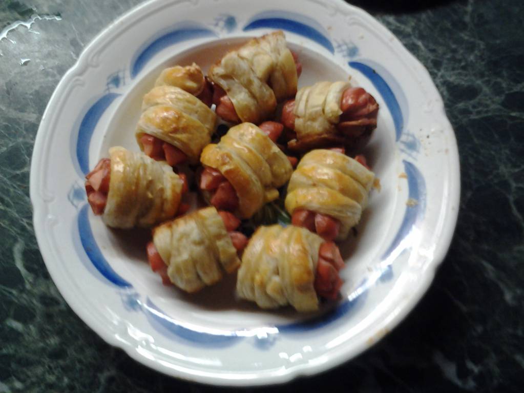 !Брала две упаковки покупного слоеного теста,дала разморозиться при комнотной темп-ре.Сосиски,(не вареные) разрезала пополам,а на концах этих половинок сделала надсечки крест на крест.Фрикадельки или тефтельки(у меня из домашнего фарша+добавлен отварной рис).Пласты теста не раскатывала,резала на полоски с длинной стороны и обматывала сосиски и фрикадельки.Противень смазала растит.маслом,духовку разогрела до 180 градусов пока мотала клубочки -моточки ,выложив смазала взбитым яйцом.Выпекала до румяной корочки.Если фрикадельки-тефтельки большие то лучше их разрезать пополам и обматывать половинки.