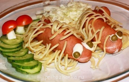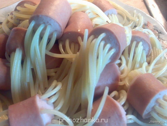 Берете сосиски и спагетти, втыкаете спагетти в сосиски как ваша фантазия пожелает и варите до готовности макарон! Все! Блюдо готово!