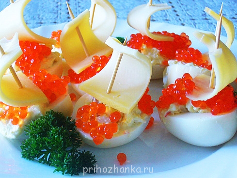 - Вспомнила, еще делала лодочки из отварных яиц. Варите яйца вкрутую, режете пополам, на зубочистку нанизываете ломтик сыра (как парус) и втыкаете в яйцо. Можно вместо сыра использовать ветчину, видела еще кусочки перца. Фото, правда, в интернете нашла только с икрой, но это уже по желанию)) нет предела творчеству!