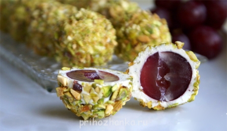 Каждую ягодку винограда облепить сырной смесью, чтобы получилось равномерно и обвалять в фисташках.