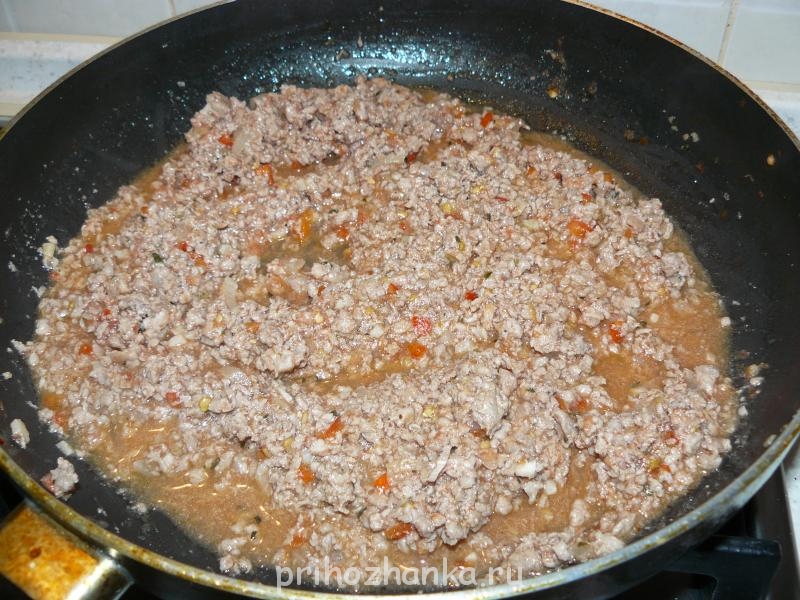 Лук, чеснок обжарить на растительном масле, добавить морковь, фарш, посолить, поперчить ( у меня была смесь перцев), тушить до готовности 20-25 мин, добавить помидоры и еще тушить 5 минут.