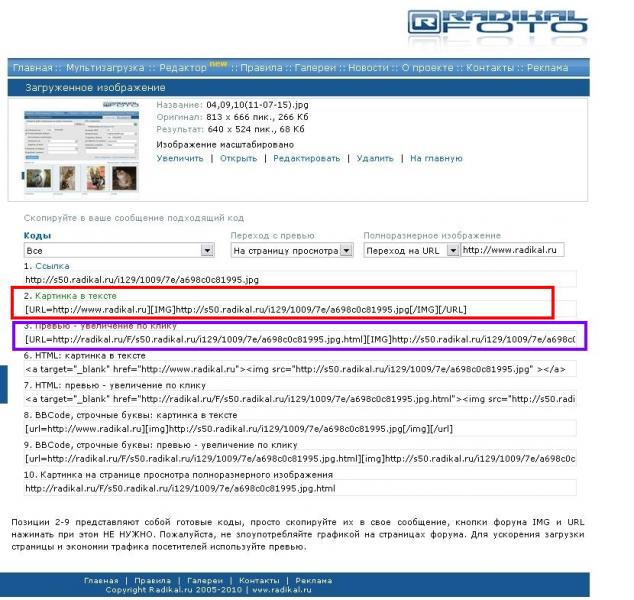 Синий Чулочек, я привыкла пользоваться Радикалом. Меня как научили, я так и делаю... Сама не умела, но это легко! Открываешь сайт http://www.radikal.ru, выбираешь через кнопку обзор нужную картинку на компьютере (1), потом снимаешь галочки (2) если это схема, если фотка, то не надо. И нажимаешь отправить (3) После загрузки открывается это окошко. Желательно при выставлении схем использовать ссылку, обведенную фиолетовой рамкой. Просто копируешь её и вставляешь в текст сообщения. А для фотографий, например, хороша ссылка, обведенная красным.