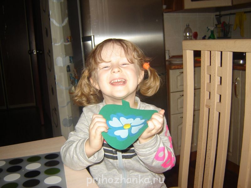 Мы в основном делаем аппликации. Последняя работа - делали цветок для Дюймовочки. Я сама вырезаю детали,дочь сама наклеивает. Дюймовочку и жаб потом дочка с папой лепили.