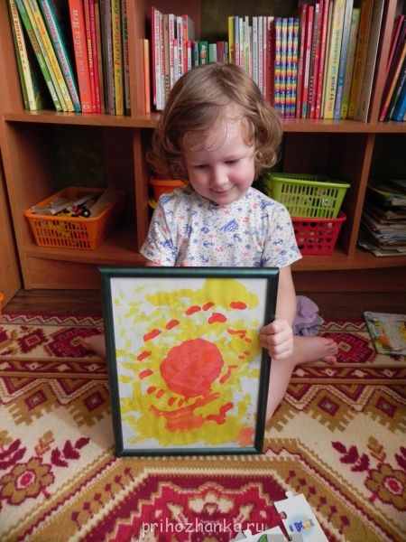 Сама рисует. Вот солнышко нарисовала,готовое уже принесла нам. Даже в рамочку оформили