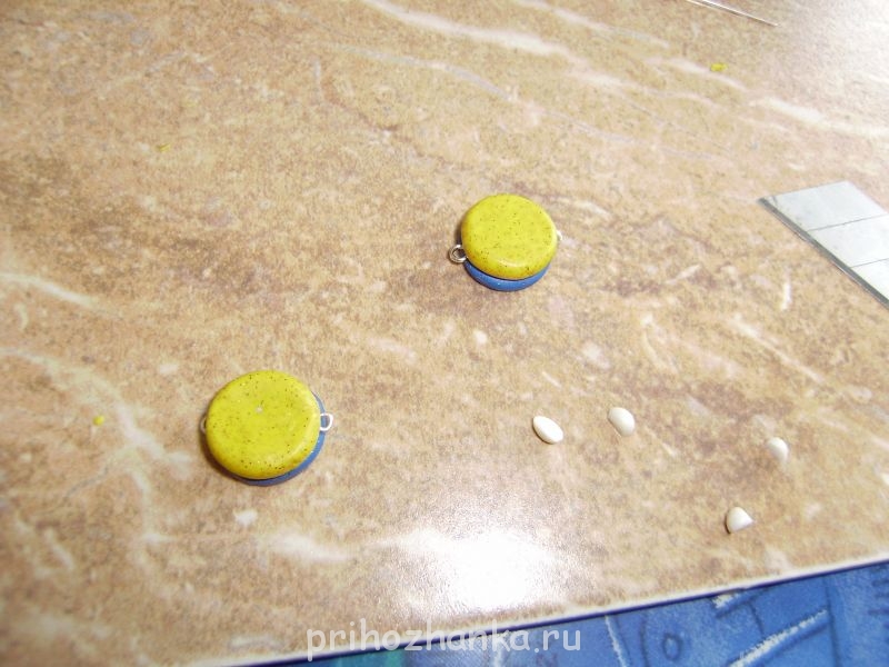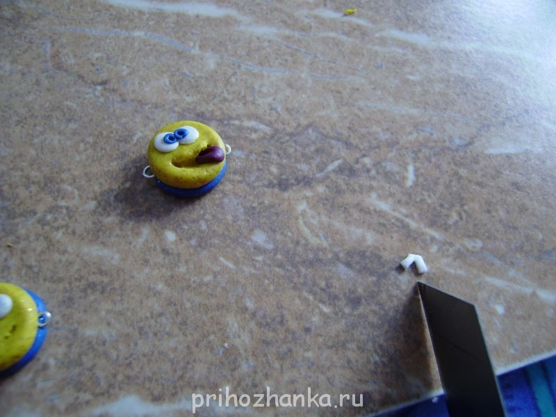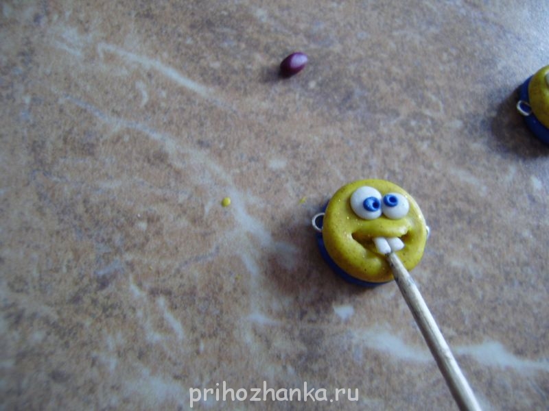Потом лепим глазки. Зубочисткой делаем зрачок и ротик.