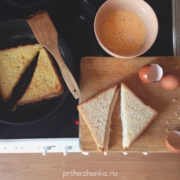 Вымачивая кусочки хлеба в получившейся смеси, выкладываем на сковородку. Жарим на среднем огне примерно по минуте с каждой стороны.