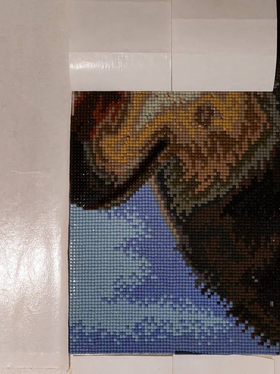 Так буду рада, если поделитесь своими советами как выкладывать большое полотно, чтобы детали не вылетали. На других моих картинах стразы крепились очень хорошо, а тут они так тесно расположены, что то и дело вылетают из общего ряда. Буду рада любому совету. Заранее благодарна