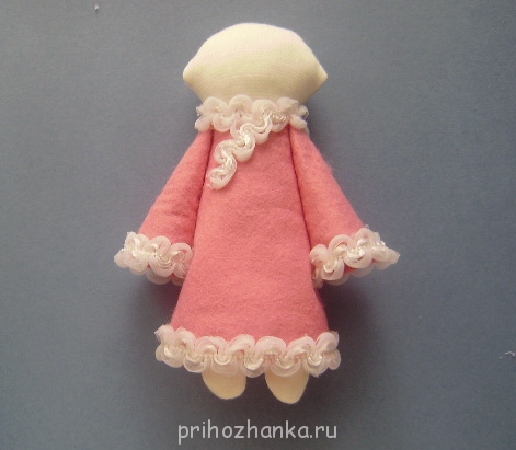 Выворачиваем. Украшаем края рукавов и платья тесьмой. Ее можно пришить, я же приклеила на горячий клей (клеевой пистолет), так быстрее