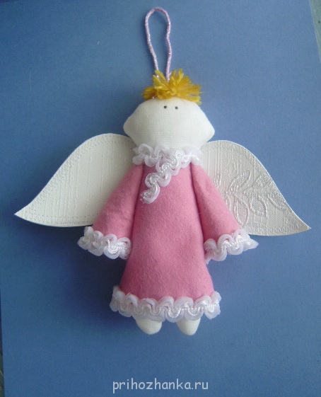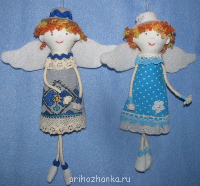 Вот так выглядит платье. У меня из фетра. Можно взять любую ткань не осыпающуюся по срезам и хорошо держащую форму. Второго ангела я сделала из трикотажа.