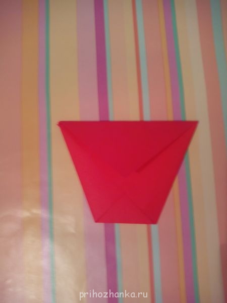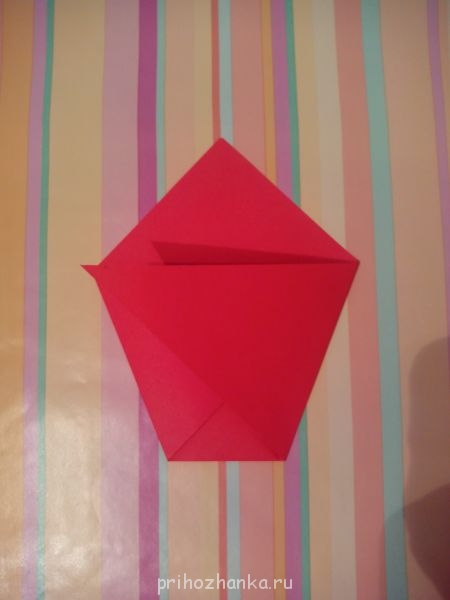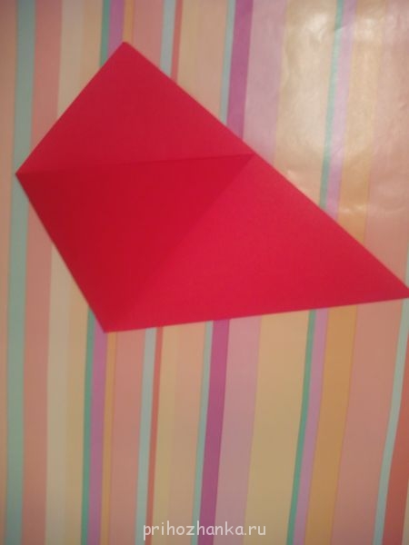 Из листа бумаги вырезаем квадрат, складываем его пополам по горизонтали, загибаем уголок (так, чтобы он коснулся противоположной стороны