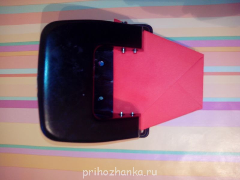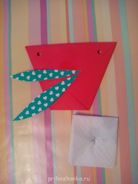 Верхние уголки тоже загибаем. Один- на лицевую сторону, другой-на изнаночную. Тоже приклеиваем, дыроколом дырки делаем