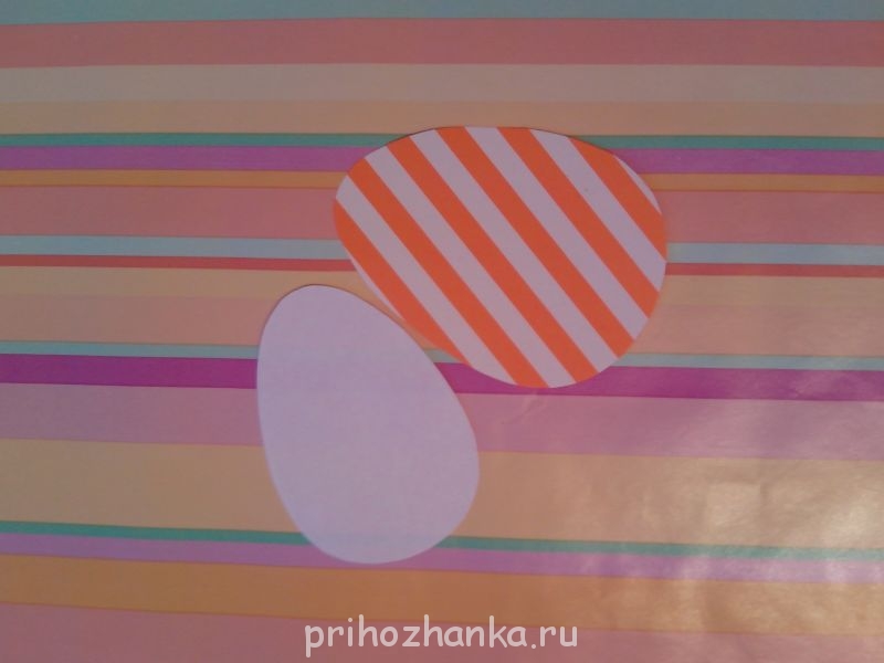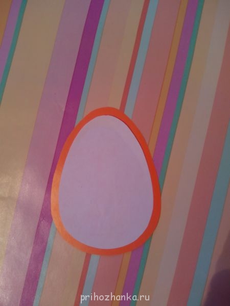 Дальше делаем яичко-открытку. Из двухстороннего картона вырезаем яичко. Из белой бумаги- тоже, но меньше диаметром