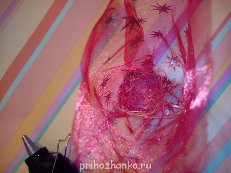 Затем приклеиваем с помощью клеевого пистолета органзу. Ее клеим , закладывая складочки