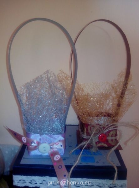К коробочке приклеиваем ручку, вырезанную из картона, бока украшаем атласной лентой (ее тоже приклеиваем) , продолжаем декорирование лентами, кружевом, бусинами, пуговицами и тд... Внутрь клеим фатин или сетку. Получаем корзиночку: