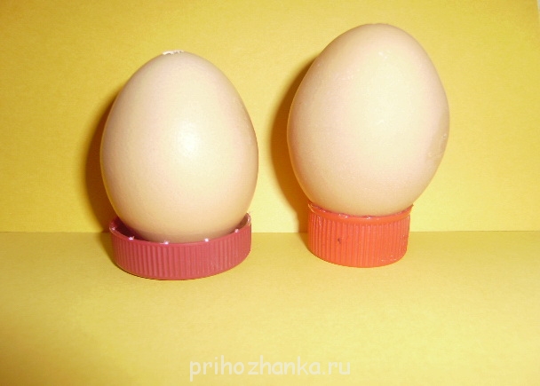 Берем выдутое яичко (скорлупу), приклеиваем к ней крышечку от молока или газировки