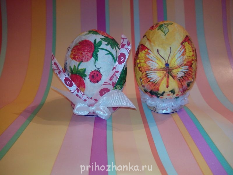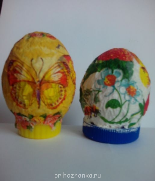 А потом заготовка дается детям. Они оклеивают яичко кусочками салфеток(делают декупаж) Детям удобно будет оклеивать яичко, держа его за крышечку. Яйцо можно покрыть лаком, а можно не покрывать