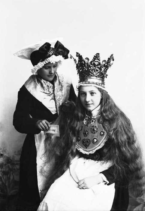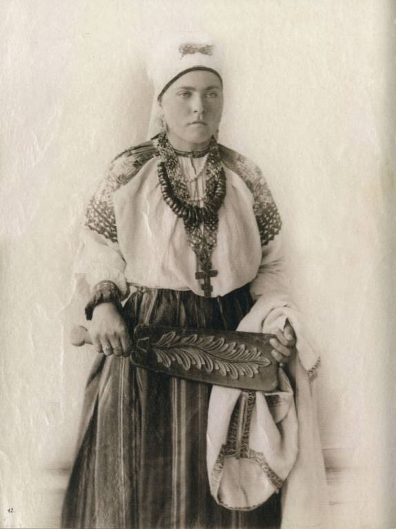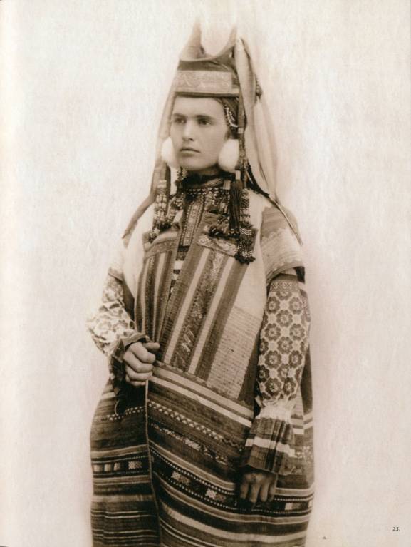 Олонецкий покосный и жатвенный костюм. Вышивка тамбур. Слева на право: реплика, оригинал (конец XIX века )