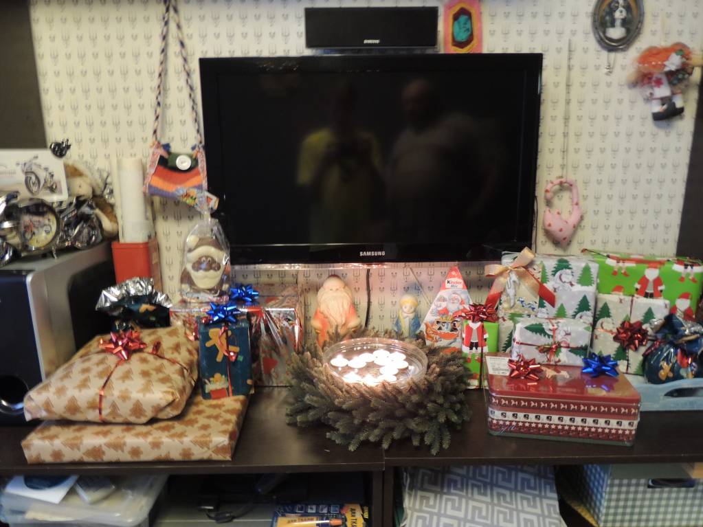 Мы уже 3ий год не ставим ёлку,а вешаем веночек и вот такую композицию создаём. Подарки все тоже сюда складываем.
