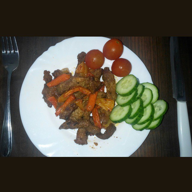 5. Когда свинина приготовится, добавляем к ней овощи, перемешиваем и немного прогреваем. Вот и все, блюдо готово! Едим без гарнира, хотя пишут, что подается с рисом... ну... как-то он не к месту показался