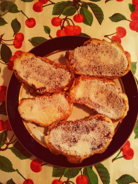 Пожарила белый хлеб, обмочив его в молоке, готовые кусочки обсыпала сахаром.