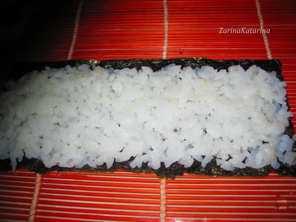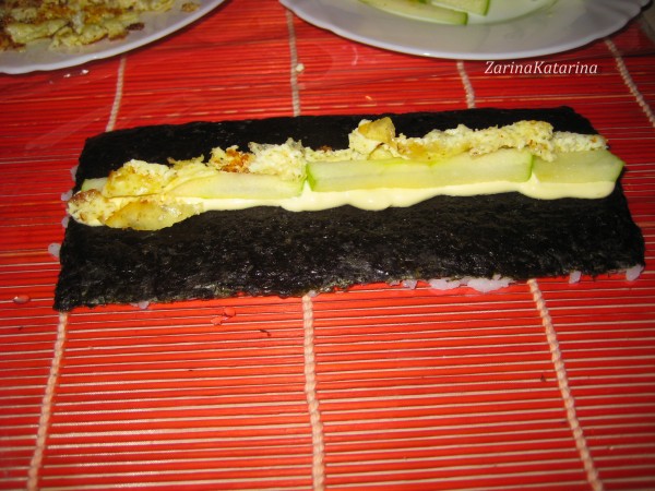 3.Коврик ( у меня был самый обычный из икеи,но он прекрасно заменил "макису") я его обернула пищевой пленкой, разрезала лист нори пополам и половину положила на пленку, гладкой стороной вниз. Не знаю где вычитала, что нужно смочить лист нори водой, но я это сделала. (потом перестала, только майонезом смазывала, так что тут на любителя) И захотелось мне его еще и майонезом смазать. Только после всего этого, выложила рис. С одной стороны листа рис немного выглядывал,совсем чуточку, а с другой наоборот, осталось пустое место, то есть свободное. (Не знаю, важно ли это вообще) 4. Затем я накрыла рис ковриком и придавила. Хорошо так придавила, тщательно прижала. Перевернула, чтобы рис оказался снизу и раскрыла. 5. Затем посередине рисуем дорожку из майонеза, туда кладем ( в моем случае) яблоко,огурец, омлет. 6. А теперь самое интересное: скручиваем ролл! Честно признаюсь, ну не могла я никак сообразить, как его завернуть то!?!?! Настоящим спасением было видео, найденное на youtube, делюсь с такими же непонимающими как и я.