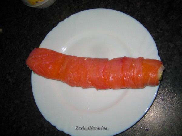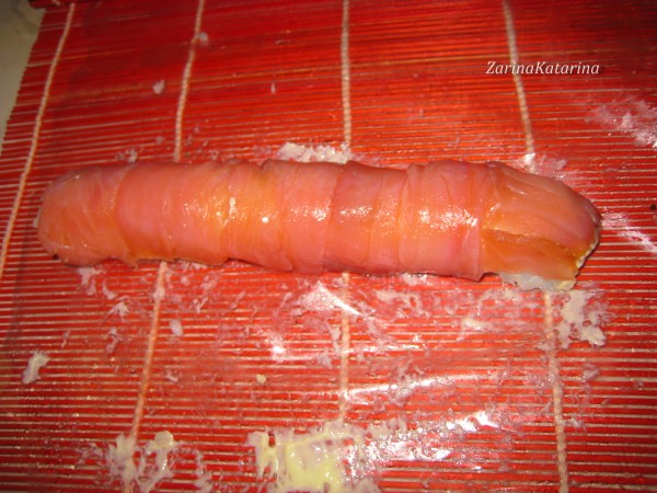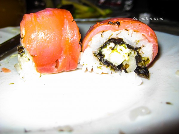 7. Далее, аккуратно прижимая тонкие ломтики семги,я выложила их на ролл. Вот так симпатично выглядит мой первый ролл! Мне захотелось, чтобы рис был снаружи, а не рыба.