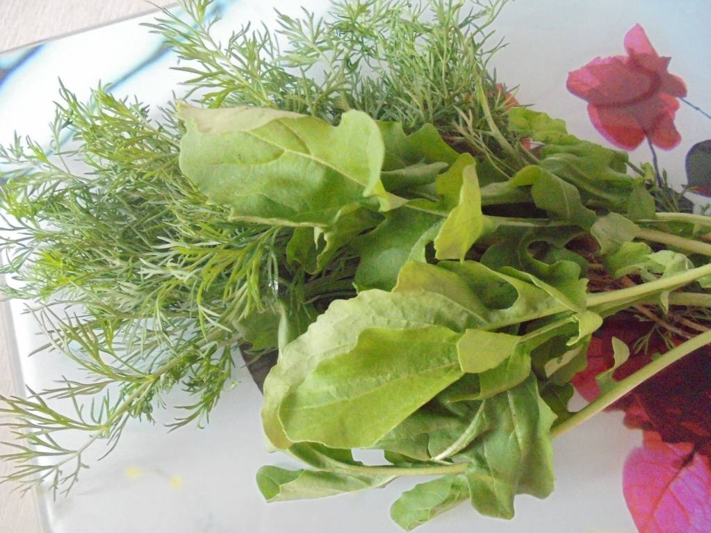 У нас ещё ничего толком нет, только лук зелёный и укроп, и тот чернеть начал, погода холодная была.-