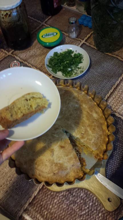 Мой творожный пирог из рассыпчатого теста. Тесто - без сахара и вообще каких-либо сахарозаменителей, начинка - творог с мёдом и корицей. Получился толщиной ок. 1 см.