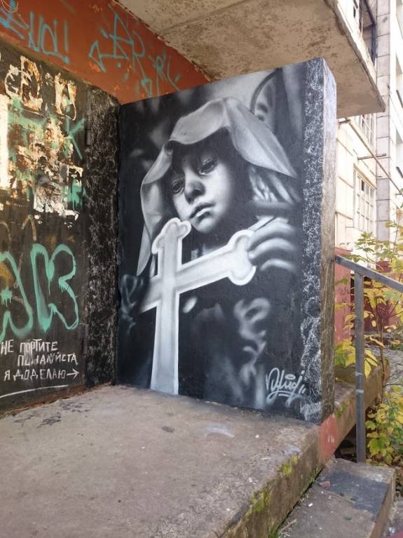 Не знаю,подходит ли в эту тему это "событие". В нашем микрорайоне,на самой окраине есть полуразрушенный дом. Совсем недавно на панели одного подъезда появилось вот это изображение. Особенно тронула надпись на двери подъезда