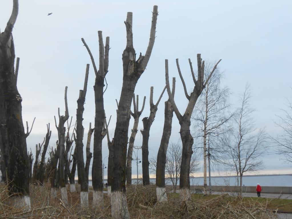 У нас на центральной набережной деревья спилили на половину, оставив одни стволы. Зрелище ужасное. Зачем так над природой издеваться. Вид ужасный портит все настроение, когда гуляешь по набережной.